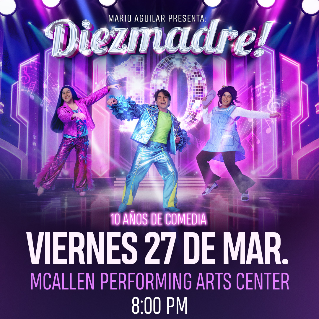 Prepárate para una noche llena de risas, energía y diversión con DiezmadrE, celebrando 10 años de comedia en vivo en el McAllen Performing Arts Center el viernes 27 de marzo a las 8:00 PM.